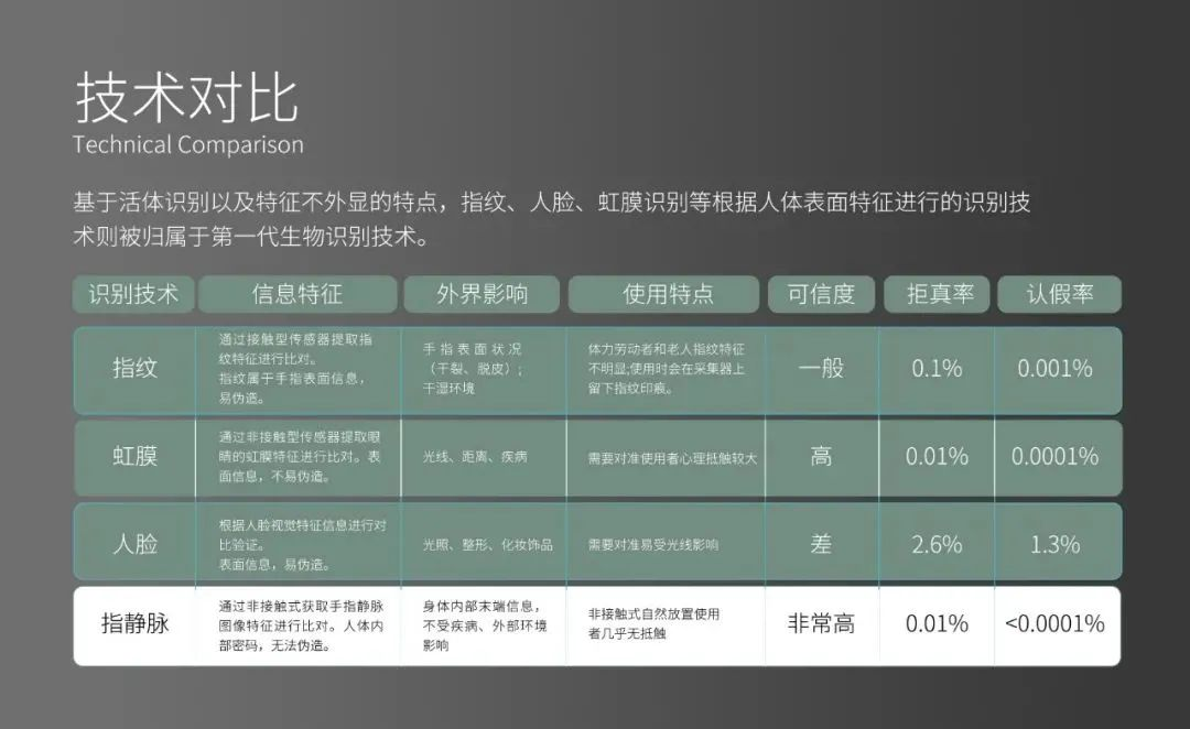 與其他生物識(shí)別相比,指靜脈識(shí)別獨(dú)顯優(yōu)勢(shì)。早在2005年就獲得了公安部一所的認(rèn)可,從而奠定了它的生物識(shí)別技術(shù)地位。之后又在2011年通過CCTV10播出的“《走近科學(xué)》特殊的人體密碼”進(jìn)入了群眾視野。